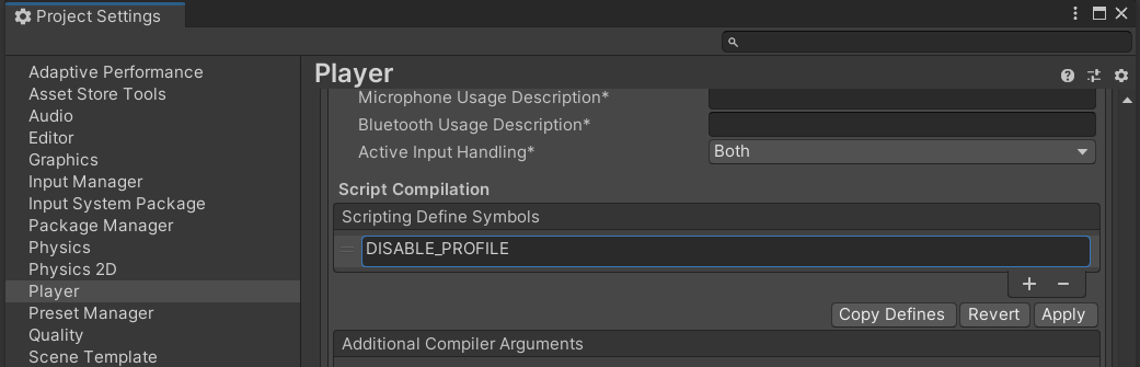 4. In the "Scripting Define Symbols" field, add `DISABLE_PROFILE` as a new symbol.