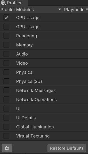 Open the profile modules settings: In the Unity Editor, navigate to "Window" > "Analysis" > "Profiler" to open the Profiler window. Then, click on the gear icon in the Profiler window toolbar to access the settings: