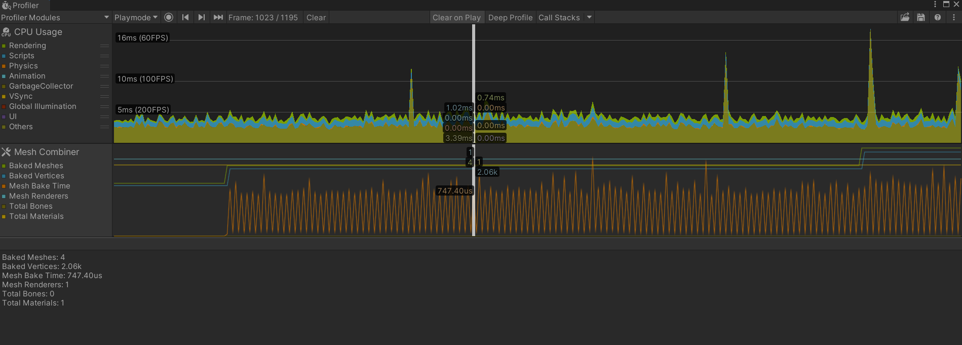 During Play mode, the Profiler window will display the performance metrics related to mesh combining, allowing you to analyze the impact on CPU usage, rendering, and other relevant metrics.