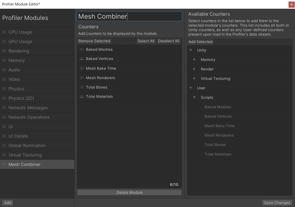 To profile various metrics and track the performance impact of mesh combining, you can use the profiling feature. Follow these steps to set up and enable profiling:
